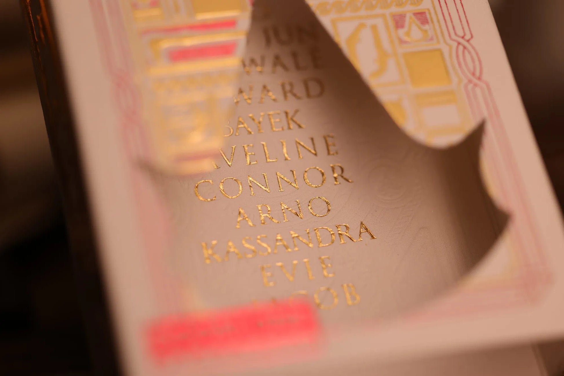 Also with the extra case as a cover, it boasts intricate embossing and hot foiling, elevating the aesthetics of the deck. Within this edition, you will find 55 fully customized playing cards, each intricately crafted to embody the essence of the Assassin's Creed saga.