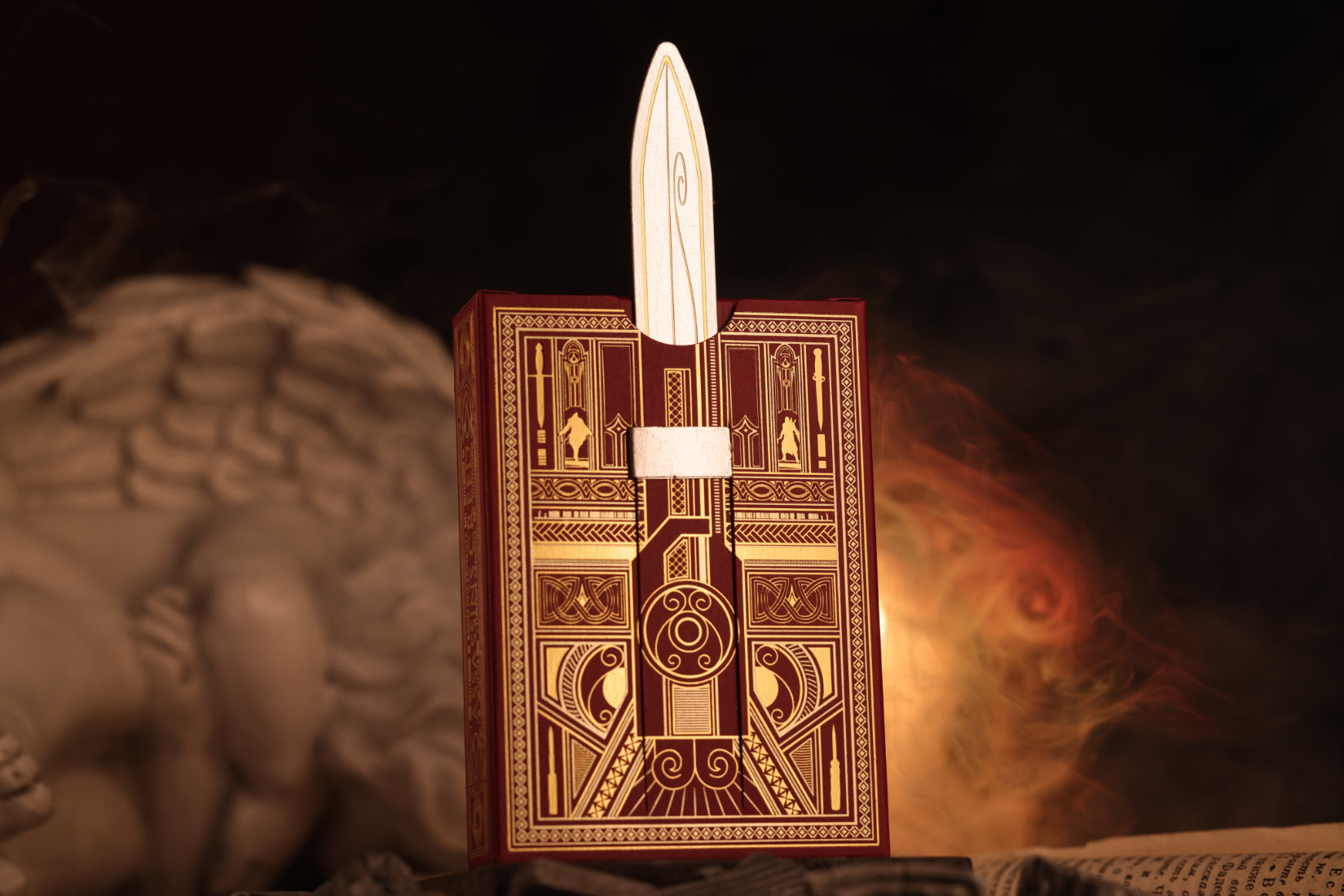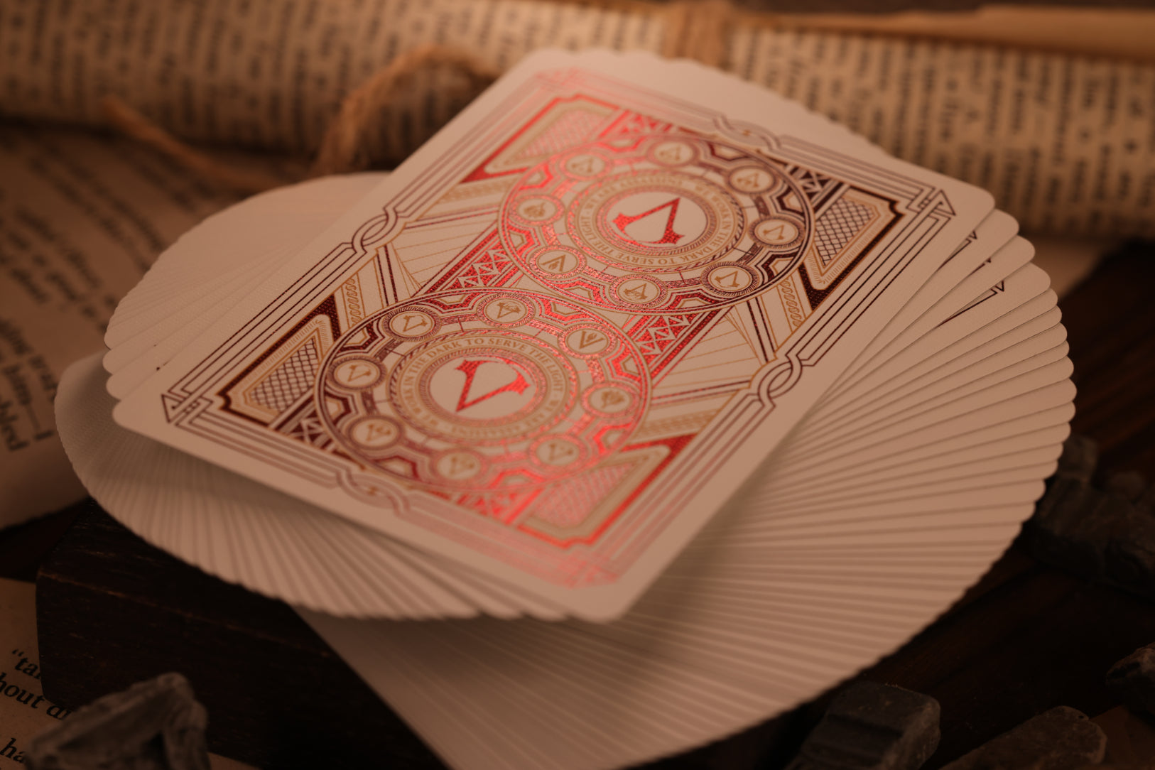 Designed for the discerning player, this deck features a 2-way card back. No matter how you hold your cards, the cold-foiled, symmetrical design remains perfectly aligned, revealing the hidden Assassin's insignia and historical motifs.