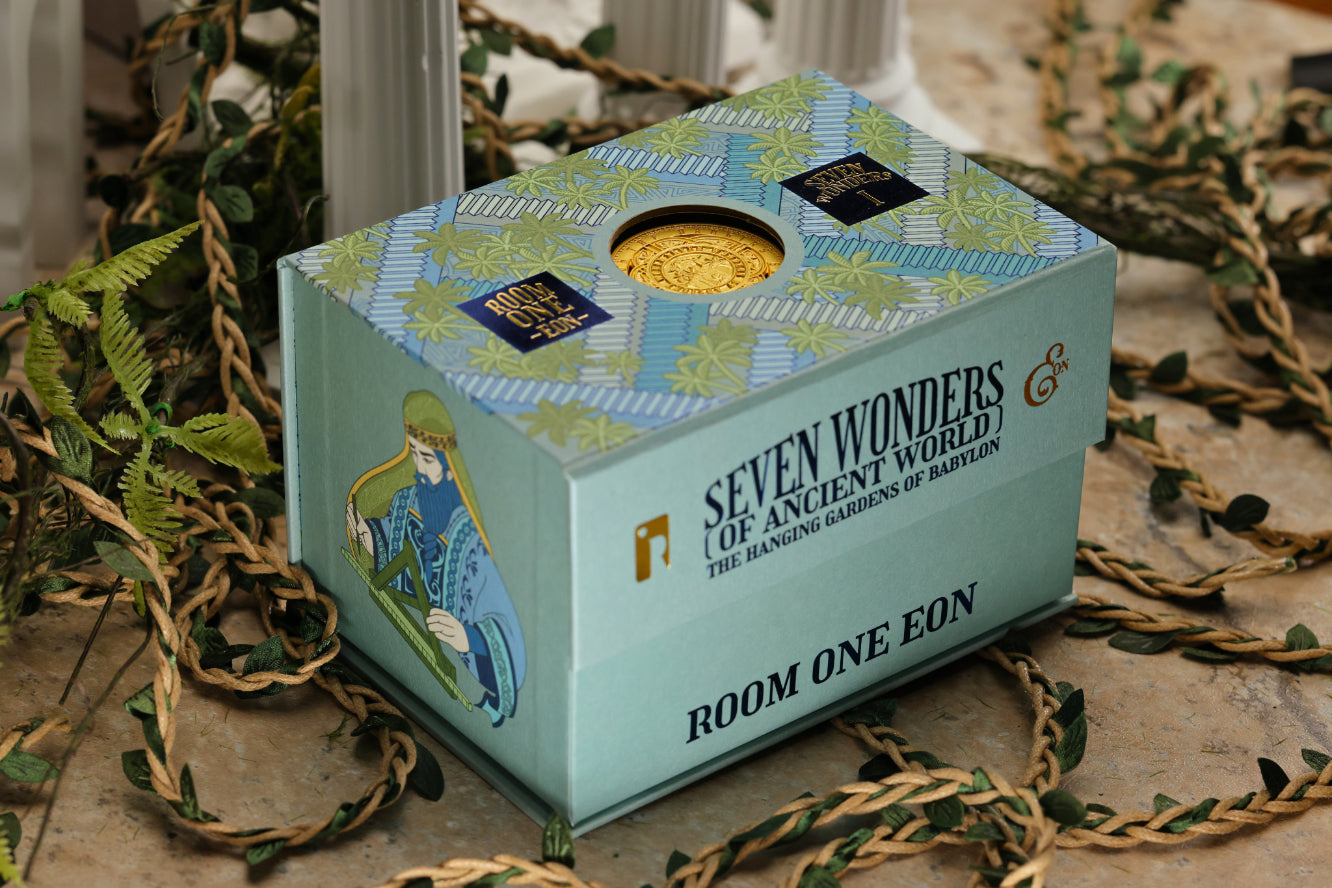 The allure of the Seven Wonders is captured in the Die-cut Window Tuck Box, a centerpiece of this release. A window is punched out of the embossed and hot-foiled tuck box, allowing us to peer into days past, where the Hanging Gardens of Babylon takes center stage as our 55th custom face card.